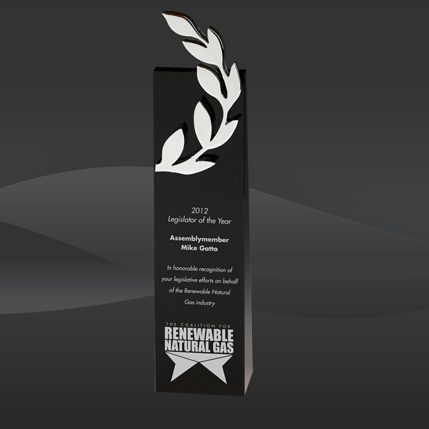 Victory Wreath Crystal Award (CIP-P64425BM, CIP-P64425BL) (Sizes: 10", 12" Tall) Crystal Description: The Victory Wreath Crystal Award features a black crystal wedge with a shiny metal victory laurel wreath mounted on top. This Crystal Award is shipped in an elegant red presentation box.