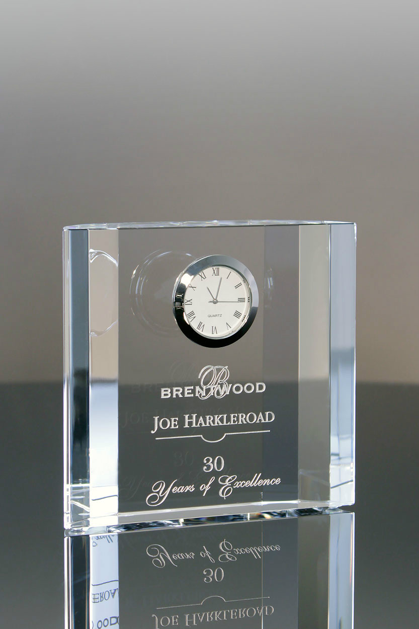 The Waltz Crystal Clock design is simple and timeless. The 1.25" thick crystal block is angled on it's sides and features a 1.5" white clock face with chrome bezel.