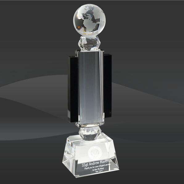 Worldwide Crystal Trophy (SCT-K210GL, SCT-K211-GL, SCT-K212-GL) (Sizes: 10", 11", 12" Tall) Crystal Info: The Crystal Worldwide Trophy Award features a round world globe mounted onto a carved crystal pedestal stand with black crystal accents. Award is mounted onto a clear crystal base. Comes packaged inside of an elegant blue presentation case.